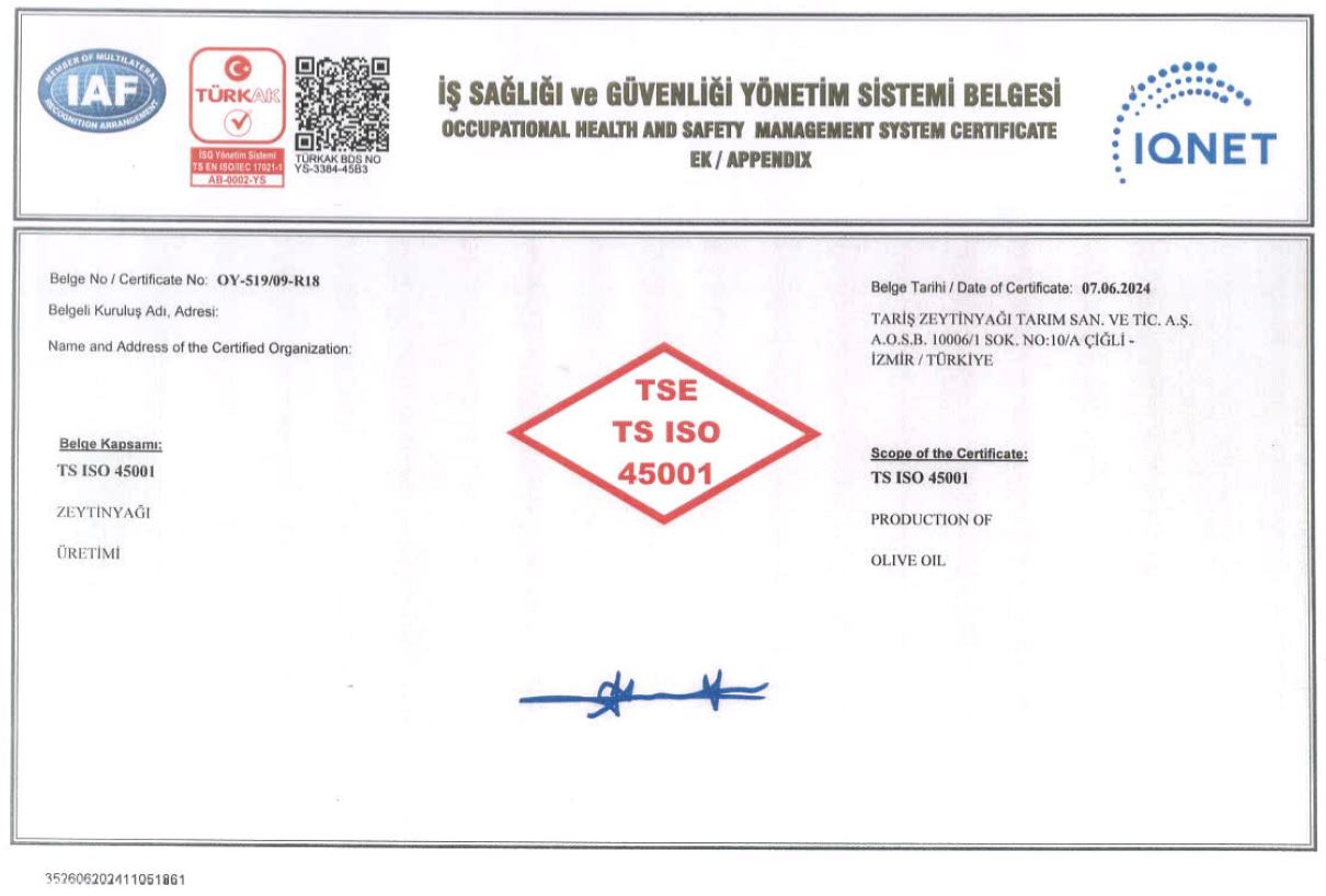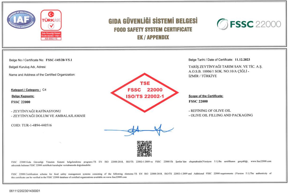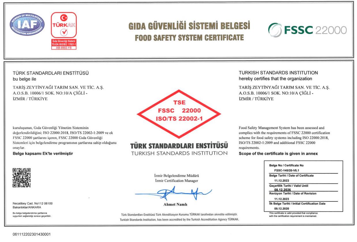 Gıda güvenliğinin sağlanması için etkin bir kontrol sistemi ile; birincil üreticiden, depolama şartlarına, üretime, tedarikçiden, taşımaya ve müşterinin memnuniyetine kadar oluşan zincirinin her basamağında yer alan kuruluşumuzun TS EN ISO 22000 şartlarına uygun bir Gıda Güvenliği Yönetimi Sistemine sahip olduğu Türk Standartları Enstitüsü tarafından onaylanmıştır.